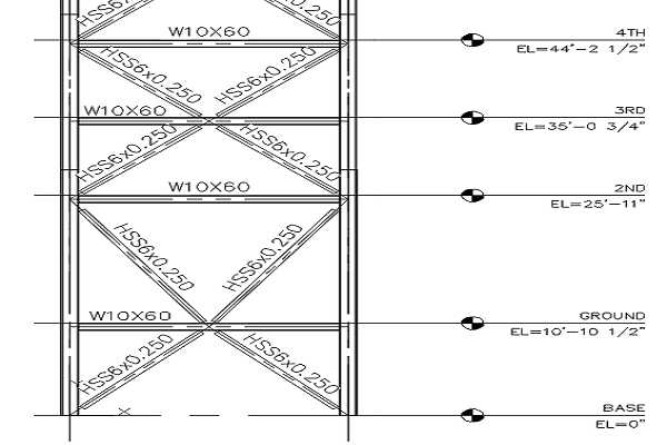 Steel elevations show member sizes, elevation levels and column splices, and can be drawn as single- or multi-line in the drawing.