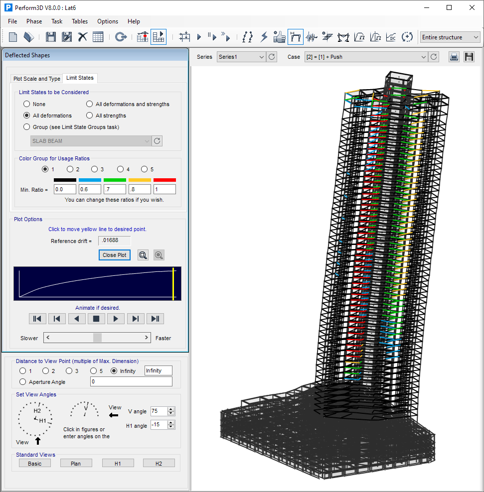 The analysis results show the status of nonlinear hinges and aggregate response is given by demand to capacity ratio for defined limit states. PERFORM-3D gives you the necessary tools to fine tune the strength-based design of a building to meet the desired displacement demand under earthquake loads!